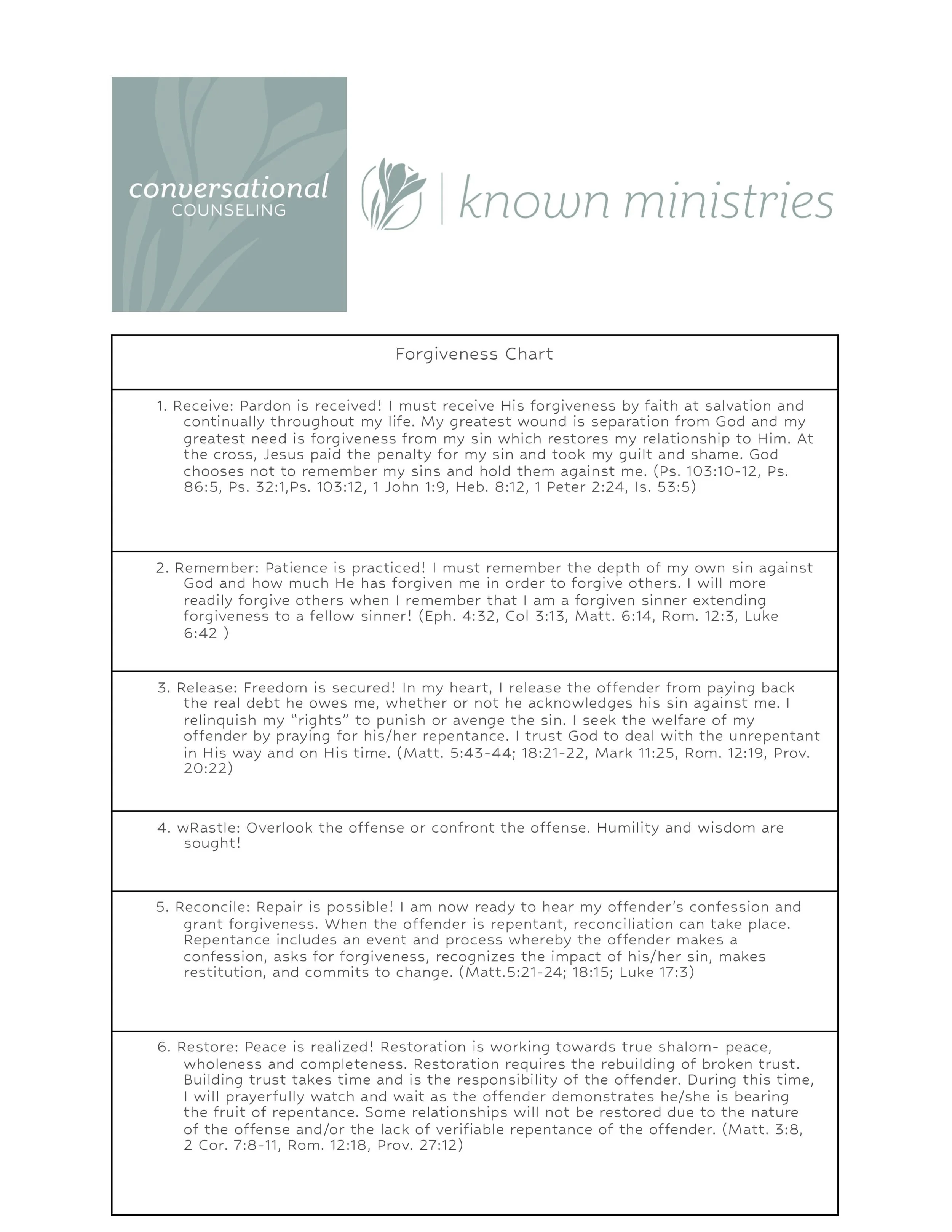 Download or view visuals and handoutsby clicking on buttons or images below Season 11 Episode 5 - Lament and Process Journal Instructions Season 11 Episode 4 - Lectio Divina Instructions Season 11 Episode 3 - Immanuel Journal Instructions Season 11 Episode 2 - Examen Prayer Instructions Season 9 Episode 4 - Progressive Muscle Relaxation Script Season 9 Episode 1 Visual - Creation to Restoration Story Season 8 Episode 4 Gospel Waltz Worksheet: Shall We Dance? Season 7 Visual - God's Storyboard Season 5 Episode 7 Protest Journal Season 5 Episode 2 Triangle Handout Season 4 Episode 8 Fear of Man: Anti-Psalm Handout Season 4 Episode 7 Bitterness: Bitterness Journal Handout Season 4 Episode 6 Depression: Personal Lament Handout Season 4 Episode 5 Guilt: Seven A's of Confession Handout Season 4 Episode 4 Anger Journal Season 4 Episode 3 Anxiety Journal Handout Season 4 Episode 3 Biblical Thought Filter Handout Season 4 Episode 2 Visual Theology Handout Season 3 "Good Listener" Handout Forgiveness Self-Counsel Journaling Prompt Download or View Season 2 Forgiveness Chart View or Download Season 1 Visuals S1 Ep.1 S1 Ep.2 S1 Ep.3 S1 Ep.4 S1 Ep.5 S1 Ep.6
